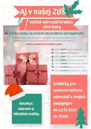 Naplňte krabicu od topánok maličkosťami, ktoré potešia babičku alebo deduška v domove dôchodcov. Často je to jediný darček, ktorý dostanú, preto do krabice nezabudnite vložiť aj kúsok svojho srdca. Krabicu následne môžete jednoducho odovzdať na vrátnici našej ZUŠ, keďže v dôsledku opatrení od pondelka 29. 11. prebieha vyučovanie dištančnou formou. Krabice zbierame vzhľadom na predĺženie pôvodného termínu 2. 12. 2021 organizátormi do 6. 12. hod. Krabice následne hromadne odovzdáme pridelenej kontaktnej osobe od organizátorov.