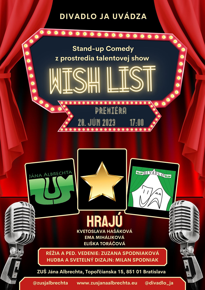 Každý má svoj „wish list“ – zoznam prianí a pre niektoré z nich je ochotný urobiť čokoľvek. Dokonca aj vystúpiť v talentovej súťaži, ak je týmto prianím práve stať sa slávnym, bohatým, a preto aj milovaným a rešpektovaným... A kto talent nemá, vytvorí si a predá svoj príbeh. Čím smutnejší, tým lepší, pretože sa bude hodiť na marketingové účely... V talentovej súťaži Wish List si svoje sily zmerajú účastníci autorskej javiskovej improvizácie plnej kostýmov, parochní a srdcervúcich príbehov. Ktorý príbeh si získa vaše srdce a bude stačiť na víťazstvo?